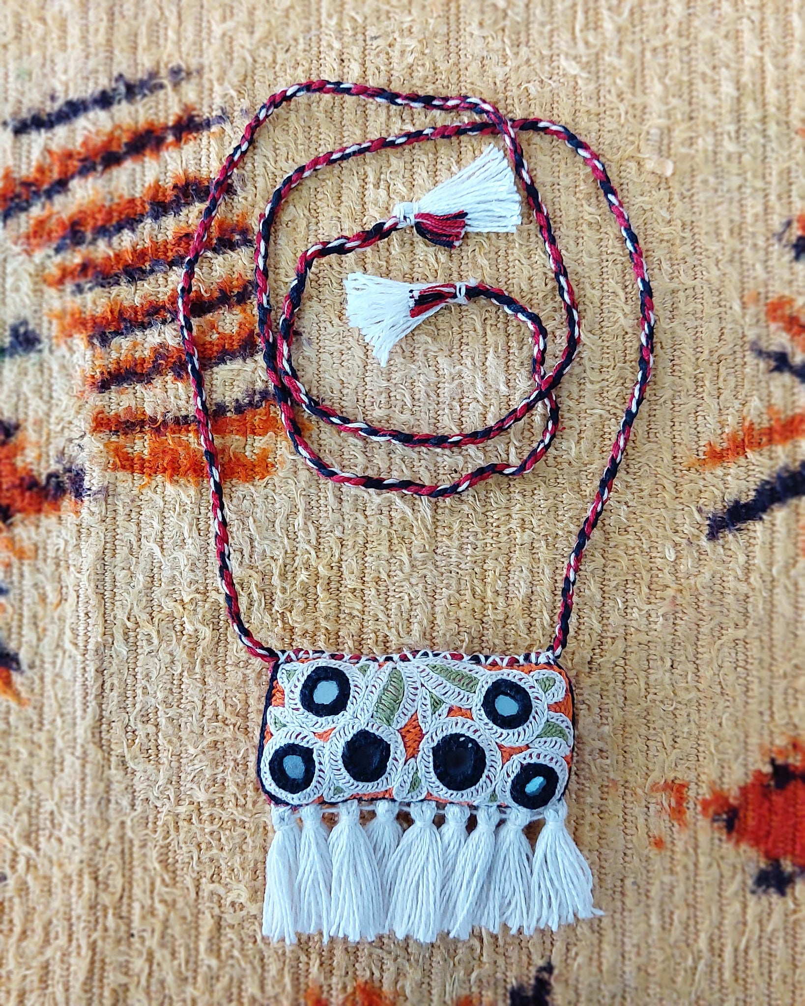 Inspired by the colors, heritage, culture, and art of India, we made these exquisite pieces of fabric jewelry with hand embroidery, applique, and mirror work. This feather-light well-crafted necklace makes an exquisite fashion statement for you to lead the fashion game at your next event!