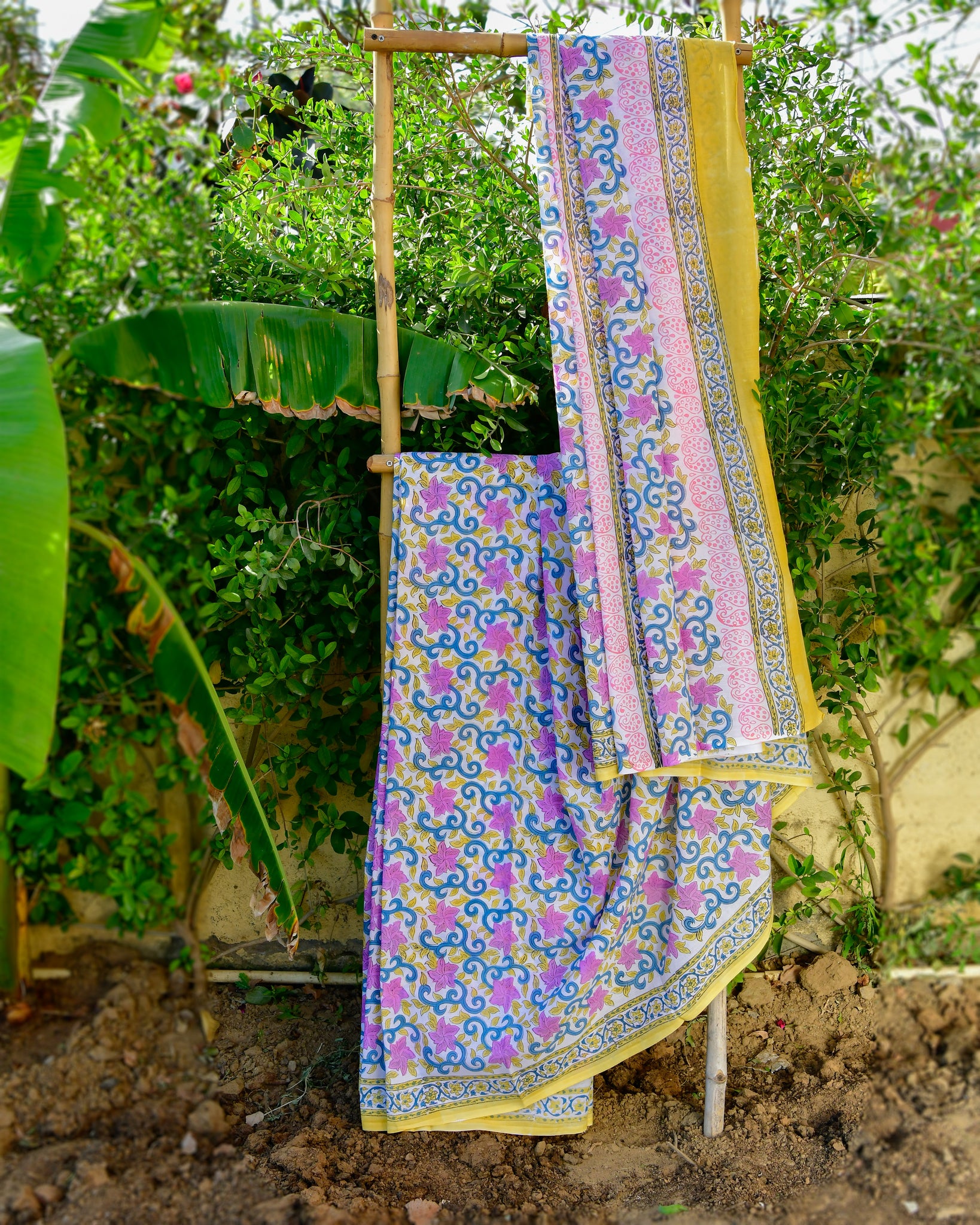 It’s a beautiful floral hand block printed mulmul cotton 5.5 mtr saree drape with an exclusive 80 cm blouse piece to go with.