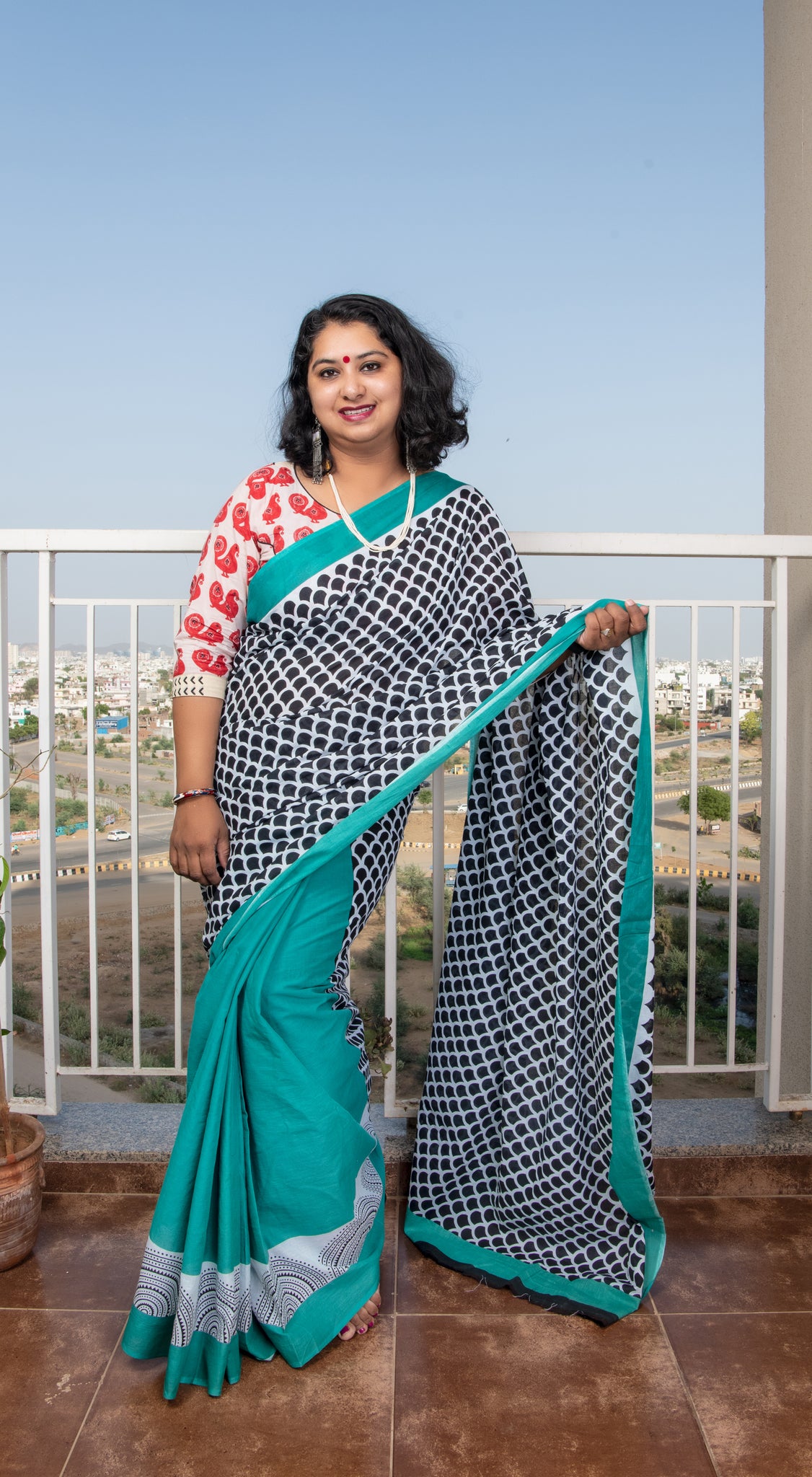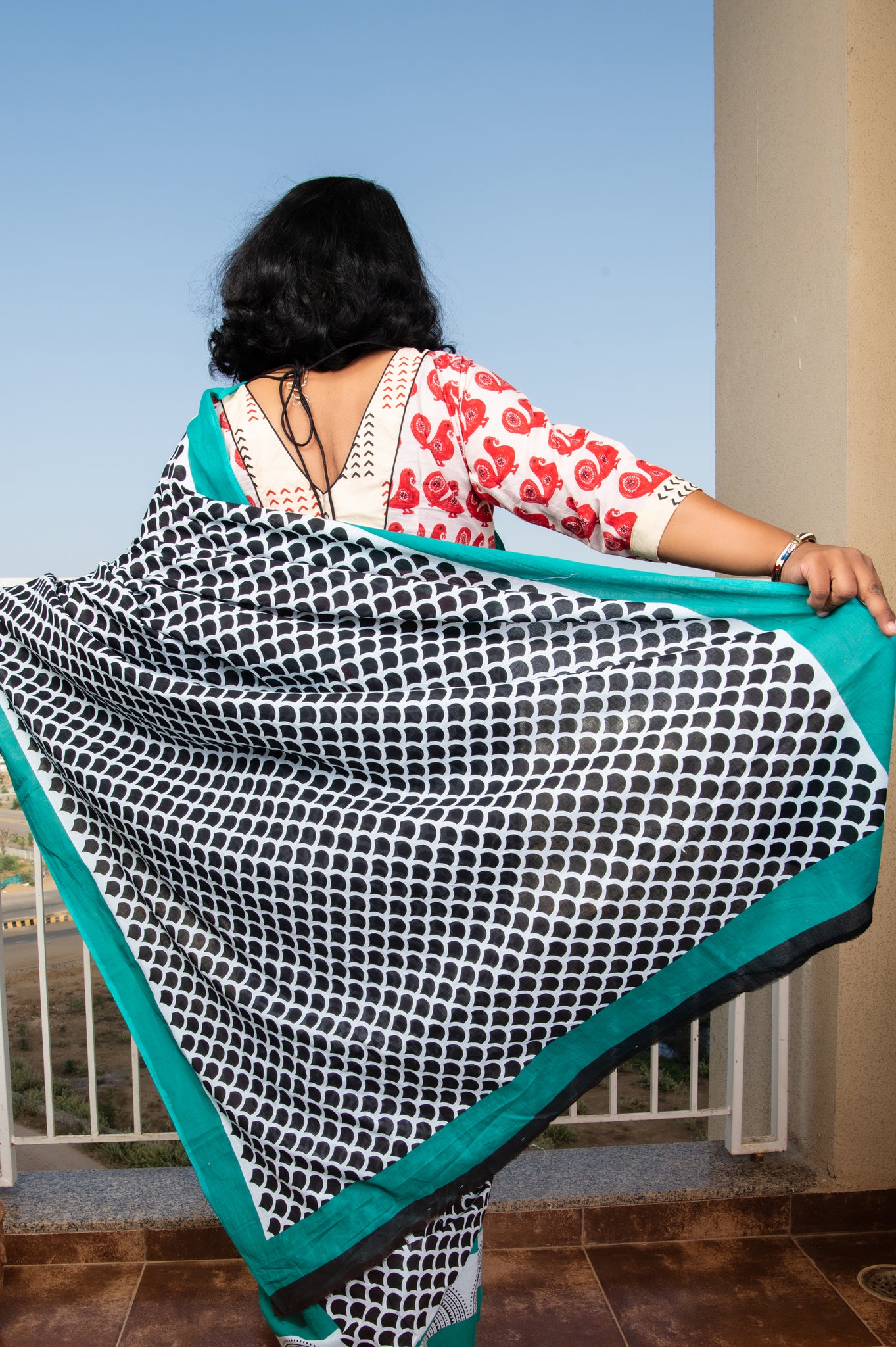 This amazing half and half saree is what your wardrobe needs this summer. Printed with love and great passion. It comes with a plain black blouse.