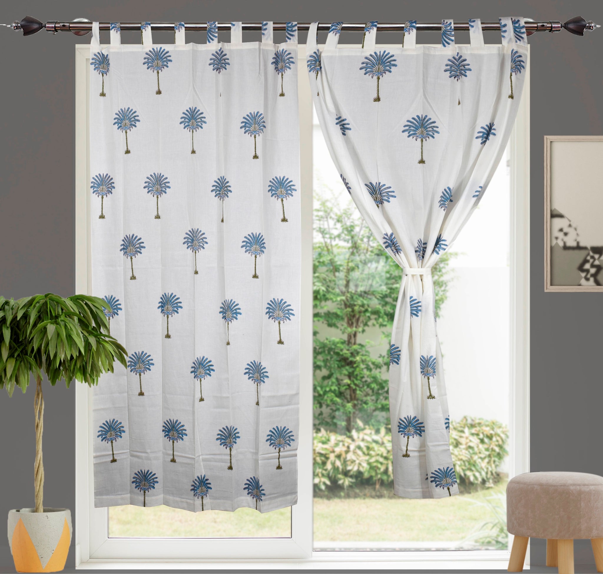 Blue Palm Tree with green trunk block printed over a white base. Each cotton curtain comes with loops for durability and easy movement. These curtains are suitable for windows & french windows.