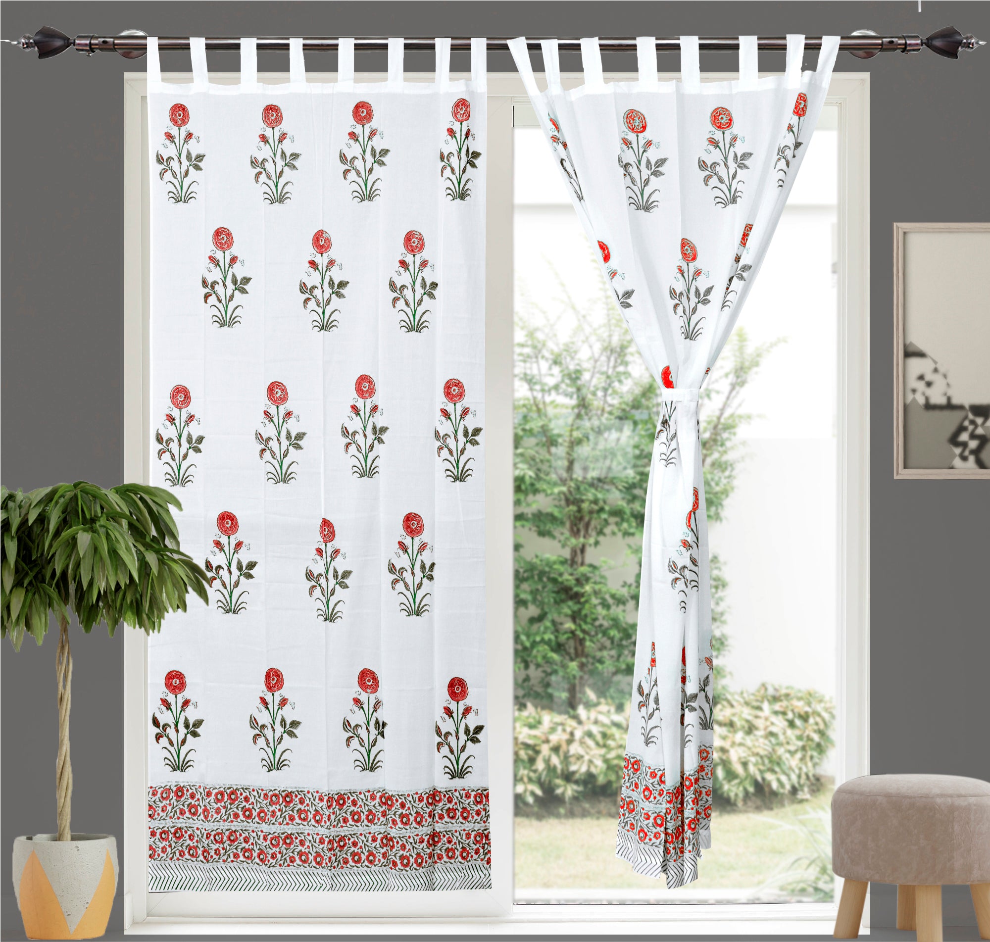 Pink rose with green stem block printed over a white base. It has a pink floral jaal border. Each cotton curtain comes with loops for durability and easy movement. These curtains are suitable for windows & french windows.