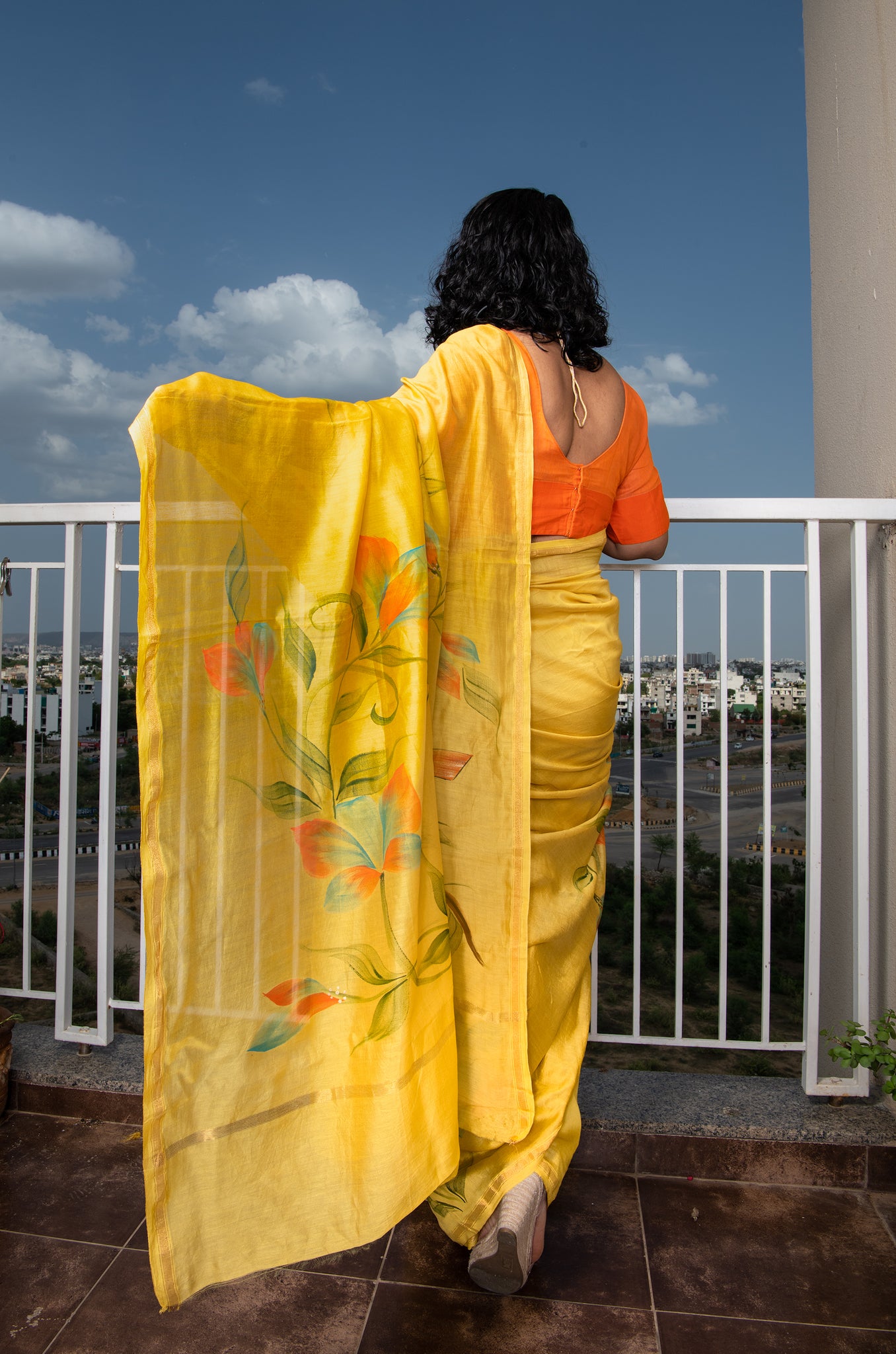 A hand-painted collection of Chanderi sarees showcase a splendid work of floral motifs. It comes with a plain red color chanderi blouse piece (90 CMS)