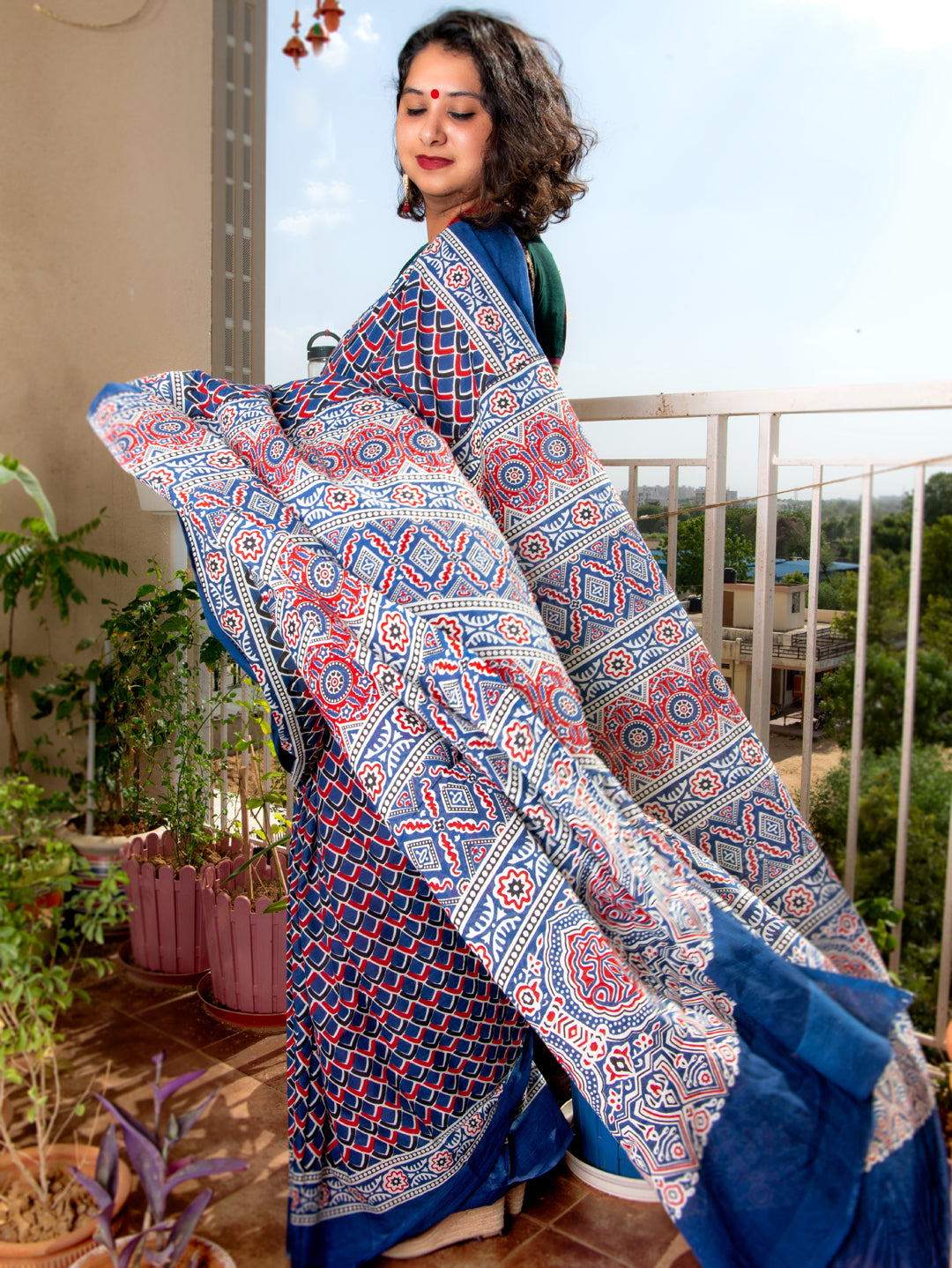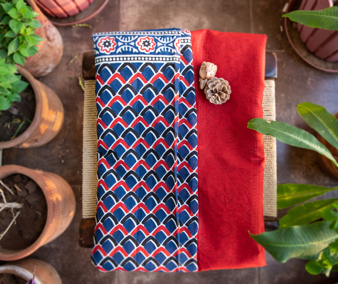 This amazing fish-inspired saree is what your wardrobe needs this summer. Hand block printed with love and great passion. This comes with an attached red blouse. It comes with a red printed blouse.