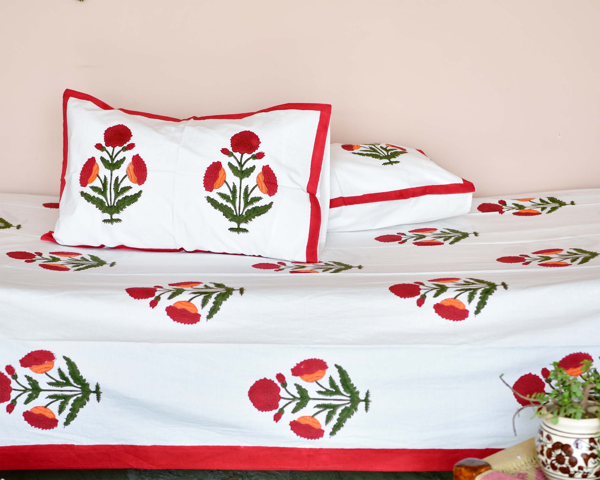 A subtle printed bedspread/bedsheet Crafted with soft glace cotton fabric also known as Percale cotton. The design pattern is stamped by hand, on premium 300TC cotton fabric with hand-carved woodblocks. This set comes with exquisite prints in vibrant colors of red marigold