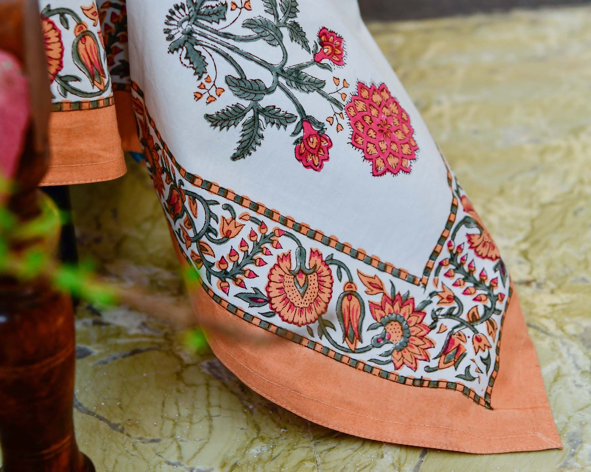 A subtle printed bedspread/bedsheet Crafted with soft glace cotton fabric also known as Percale cotton. The design pattern is stamped by hand, on premium 300TC cotton fabric with hand-carved woodblocks. This set comes with exquisite prints in vibrant colors of red marigold
